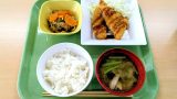 ご飯 / もやしと豚肉のスープ / 鶏肉の唐揚げ / 刻み昆布