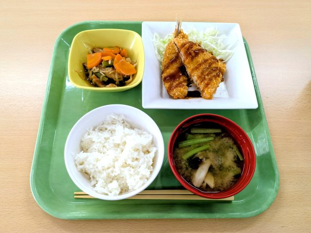 ご飯 / しめじと青菜の味噌汁 / アジフライ / 切り干し大根の煮物
