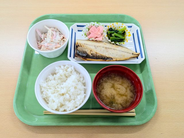 ご飯 / 豆腐とワカメの味噌汁 / さばの塩焼き / ごぼうサラダ