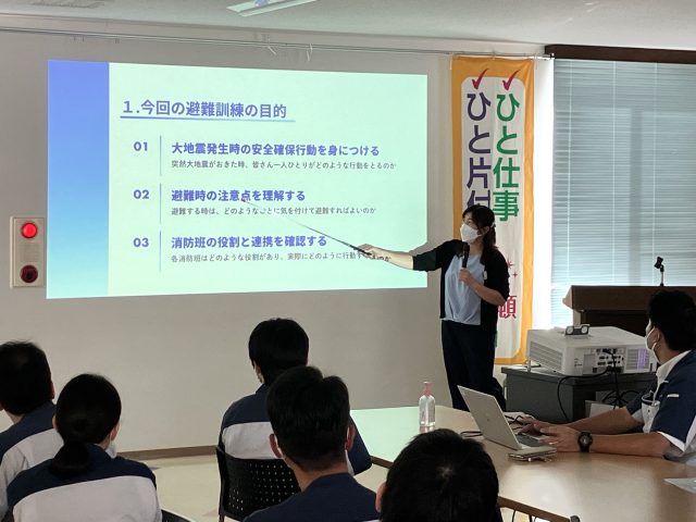 この度、当事業所ではBCP(事業継続計画)推進の一環として、大地震を想定した避難訓練を実施することといたしました。そして訓練をより実効性の高いものとするため、従業員約50名を対象に事前勉強会を行いました。