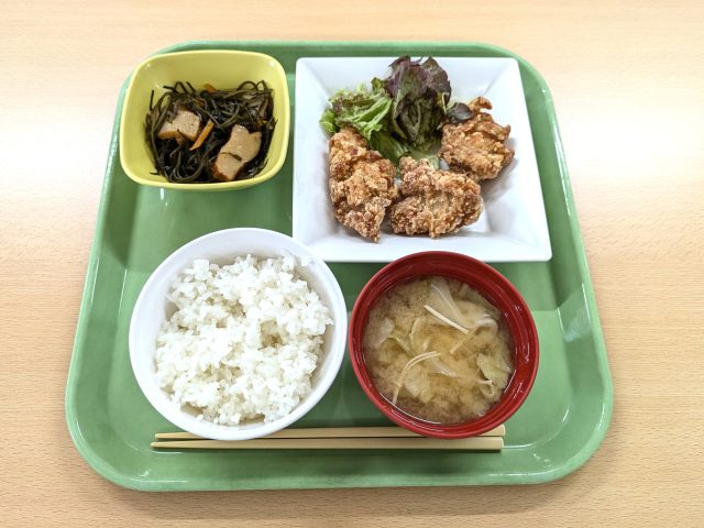 ご飯 / えのきとキャベツの味噌汁 / 鶏肉のから揚げ / 刻み昆布煮