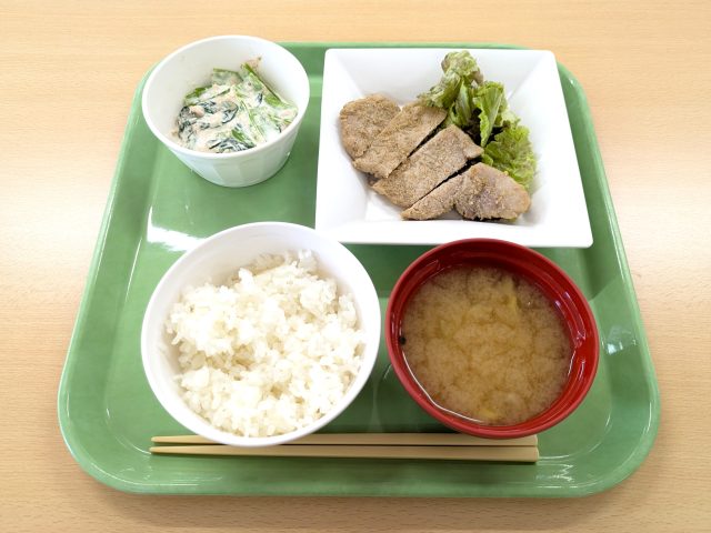 ご飯 / しめじとキャベツの味噌汁 / 豚肉のごま風味焼き / 小松菜のツナマヨ和え