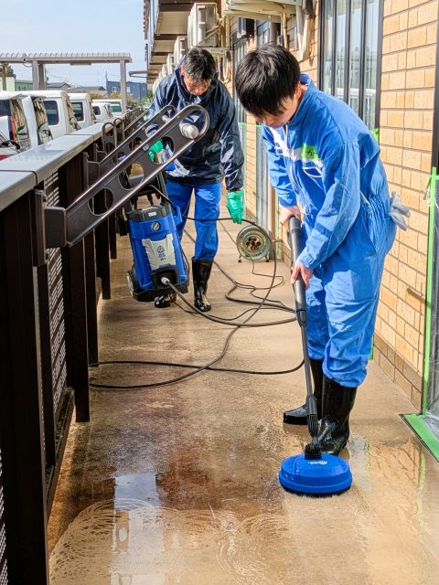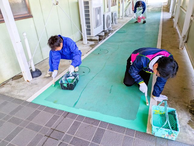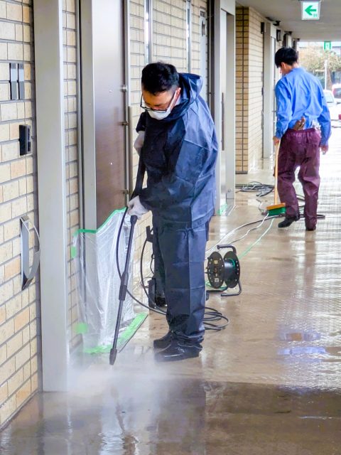 秋とはいえ強い日差しの下、皆様のご協力とご尽力により、日々の活動で剥がれてしまっていた通路や白線がとてもきれいに整備され、また住宅棟の廊下は今回初めての大規模洗浄となり、蓄積した汚れが見違えるほどにすっきりと落ち、とてもきれいになりました。