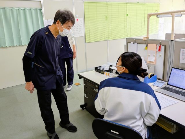 産業医の先生には、工場内の健康管理室にて従業員の健康診断結果の確認や、体調に不安のある方の個別面談を行っていただき、その後、各職場の巡視を行っていただきました。