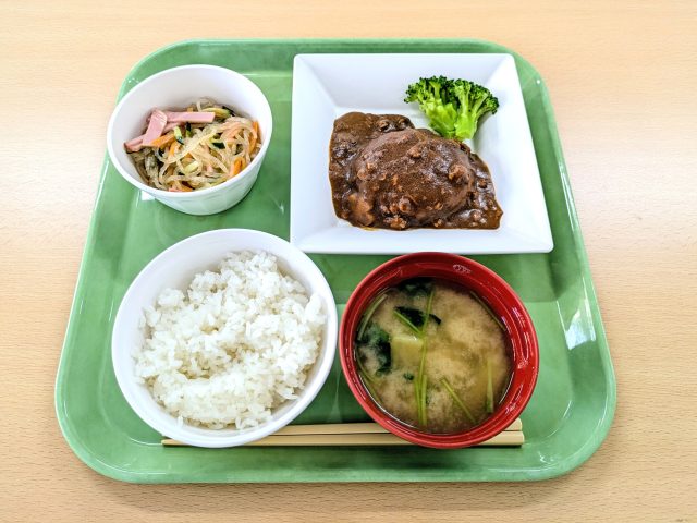 ご飯 / 三つ葉とさつまいもの味噌汁 / チーズ入りハンバーグ / 中華和え