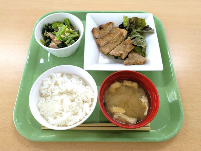 ご飯 /ワカメと油揚げの味噌汁 / 豚肉のごま風味焼き / 小松菜の卵とじ