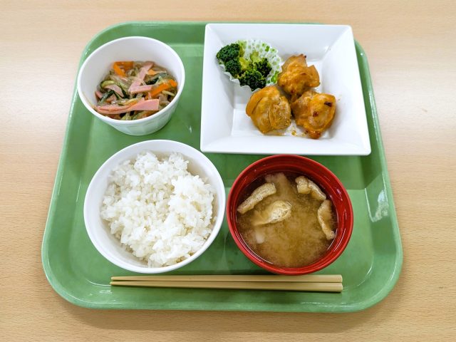 ご飯 /大根と油揚げの味噌汁 / 鶏のみそ焼き / 中華和え