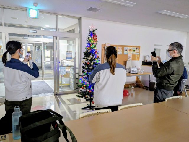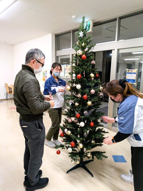 毎年、ツリーの設営は総務の職員が行っていましたが、今年は利用者さんと一緒に飾り付けをしたいと思い、利用者さんをお誘いし一緒に飾りつけを行いました♪