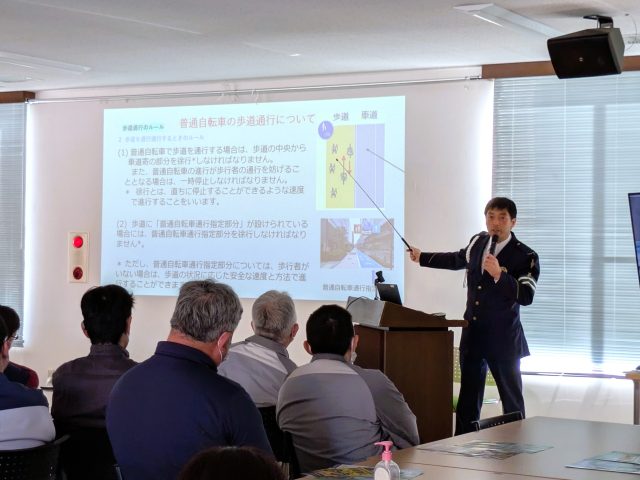 講話では、交通反則通告制度の概要説明から始まり、どのような行為が青切符の違反となるのか、また、どのような行為が赤切符の違反となるのかなど、動画や資料を用いて具体的に大変わかりやすくご説明いただきました。